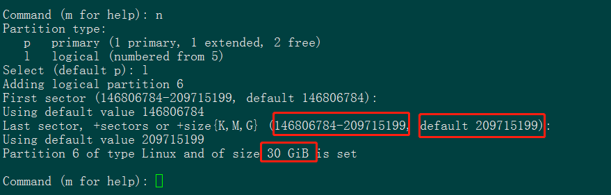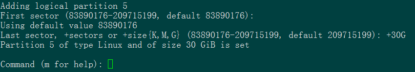 4、输入逻辑分区大小,同主分区设置类似,采用+size{K,M,G}方式,只接输入逻辑分区大小 +30G