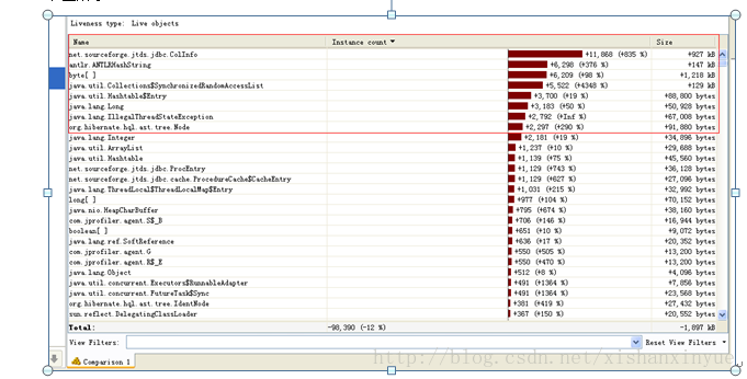 a、 一个强大的定位工具是使用 jprofiler,通过jprofiler可以实时的监控到,当前的堆内存的总体使用情况及当前存活的对象、大小、分配树、对象引用链等等,功能非常全面。如下图所示: