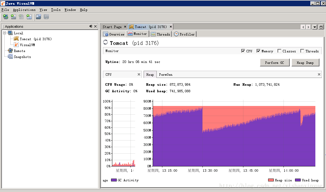 d、 通过visualVM程序监控JVM,JDK 1.6中自带的可视化监控工具,这个工具比较实用,功能也比较强大。可以监控线程信息,堆内存信息,还可以实时导出堆信息以及强制GC。监控本地JVM直接启动该工具后就可以监控,远程监控需要启动jstatd和jrxml。