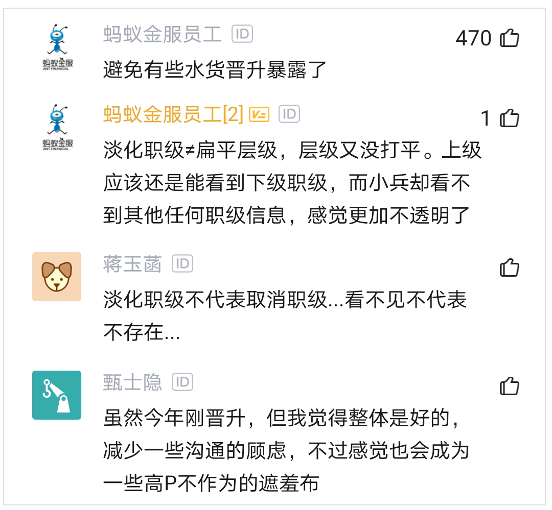 @还有网友分析到:淡化层级的一个好处是会扁平一点,终生平等,当然这是理想,实际操作还是难