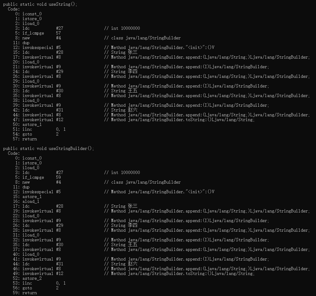 使用 javap -c StringTest.class 反编译查看两个方法编译后的文件: