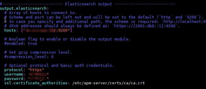 然后,安装Elastic APM Server,就是一个Linux RPM包,一行Linux命令的事情,也不做赘述。这里交代下APMServer的几个关键配置,以centos7为例。在/etc/apm-server目录下,有个apm-server.yml配置文件,修改其中如下几处: