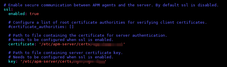 SSL启用,代表各agent需要以https方式来链接apm-server,换成你自己的证书和key:
