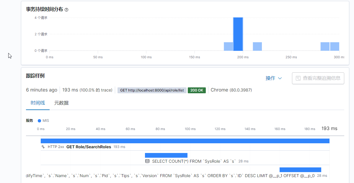 可以看到,searchroles的所有请求数量,每个请求各环节执行时间,最下面默认展示最近一次请求的跟踪数据,里边可以直观体现本次http请求处理总时间、数据库执行时间,如果有跨服务调用,还会统计其他服务调用时间,甚至帮我们追踪到了执行的SQL,非常之方便,开箱即用。所以,以后再也不要说EF性能低、出问题不好定位之类的话,一定是你姿势不对。