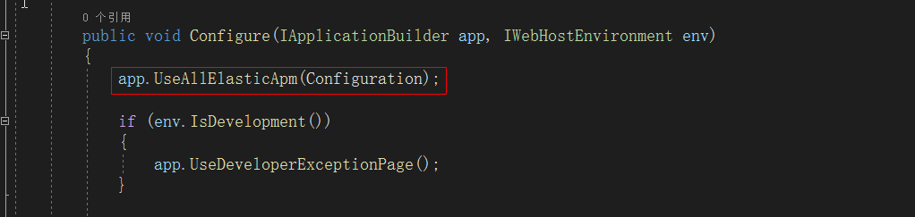然后,引入Elastic.Apm.NetCoreAll包,ElasticStack包含各种原子包,可以分别监控.NETCORE、aspnetcore、EF等,可以根据具体需求引入对应包,而Elastic.Apm.NetCoreAll直接囊括所有,这里因为系统要监控应用、EF、数据库执行等,所以直接引用了这个大而全的包。之后,引入中间件: