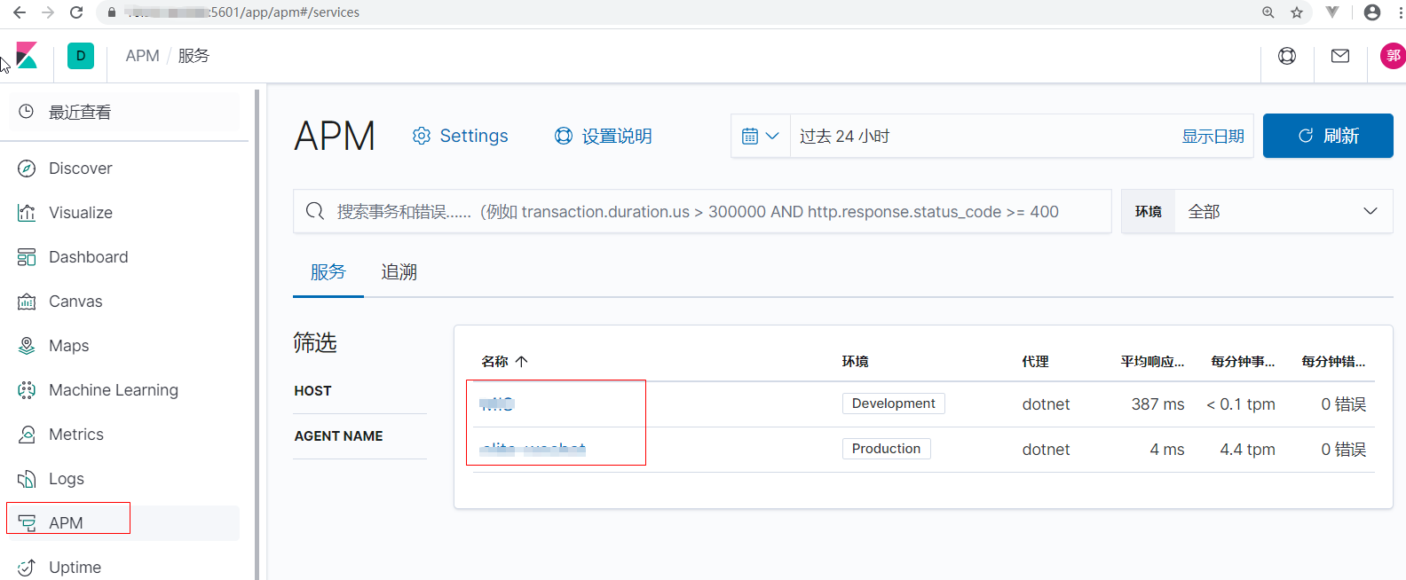 然后,我们进入kibana,找到对应的APM菜单进去: