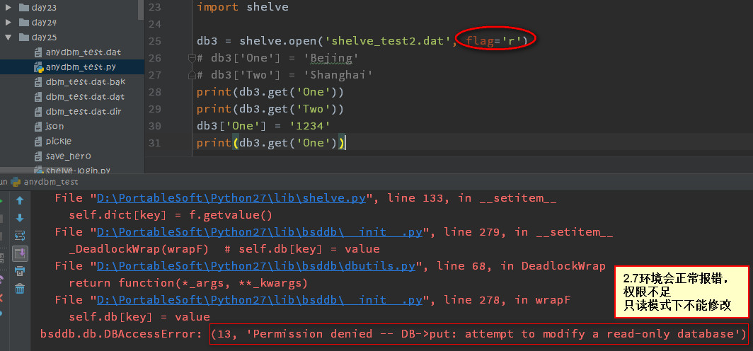 小结: 1、shelve模块将内存数据以字典的类型(key,value)通过文件持久化,模拟出简单的db效果。 2、shelve模块可以持久化任何pickle可支持的python数据格式,但是它的key必需得是字符串。 3、shelve可以看作是pickle模块的一个封装,但它实现了可以多次dump(后面的dump不会覆盖前面的)和多次load。 4、shelve访问己有key时,实际上取出的是数据源给出的一份拷贝, 所以对于拷贝做出的增加和删除等操作都需要用writeback=True参数才能实现写入回源中进行修改。 5、shelve对于d[key] = data这种操作,视为存储数据,无则新增,有则覆盖, 与访问key对当中的值(条目)进行修改默认不回写并不矛盾和冲突。 6、默认安装环境下,shelve中的r只读模式在python2.7能生效,在3.5环境中则不能生效。 有很大可能是与2.7中存在anydbm模块,而3.5中只存在dbm模块而不存在anydbm有关。