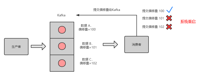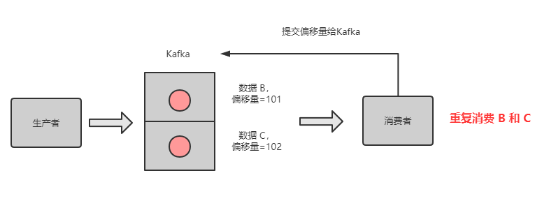 重启后,消费者又是拿偏移量 100 以后的数据,从偏移量 101 开始拿消息。所以数据 B 和数据 C 被重复消息。