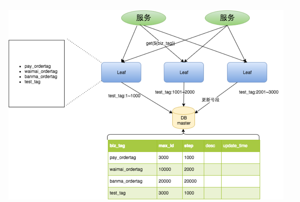 容灾性高:Leaf服务内部有号段缓存,即使DB宕机,短时间内Leaf仍能正常对外提供服务。