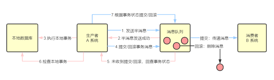 第七步:若 A 系统执行本地事务失败,则 MQ 收到 Rollback信号,丢弃消息。若执行本地事务成功,则 MQ 收到Commit信号。 -