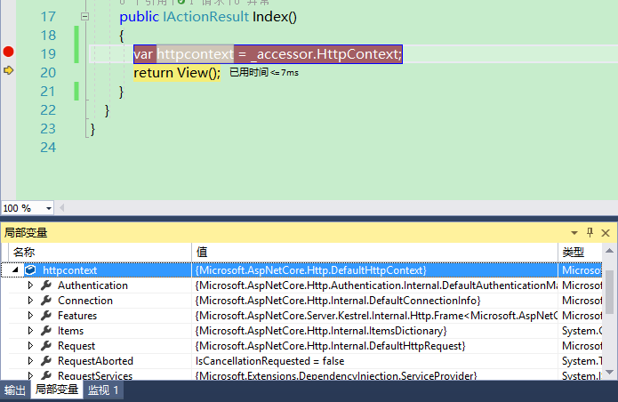 运行以后就能获取到 HttpContext 对象。上面也说到,必须在程序启动时注入才能获取到HttpContextAccessor。