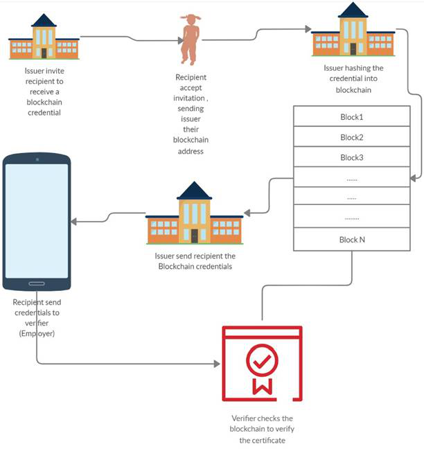 开发、授予和确认教育证书的系统[25]。它是一个开放平台,用于开发验证或验证基于区块链的政府文档的应用程序。这可能涉及市政数据证书、学历证书、技术许可证、劳动力增长等。它包括许多开源集合、技术和移动应用程序,这些技术和应用程序支持分散的、基于标准的、以受益人为中心的环境,通过区块链账本实现不可信的验证。区块证书的用户利用并推动开放平台的整合。它致力于为所有个人提供自动主权身份,并使接收者能够通过更容易使用的方法(如移动应用程序)来监控他们的声明。图5展示了Blockcerts应用程序的工作过程。
