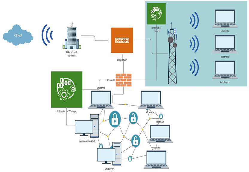 这一研究策略拓展了在网络上利用fog和区块链技术扩展事物连通性的研究[5]。使用无线通信从一个规范到下一个规范的交换信息从1973年开始以无线网络分组的形式开始。一台机器能够与另一台规格相同的机器连接。在2017-2020年间,其他几位作者发表了大量关于区块链和物联网的文章。图2表示教师、学生、运营商、雇主和认证单位成员可以使用区块链物联网框架进行通信的框架。