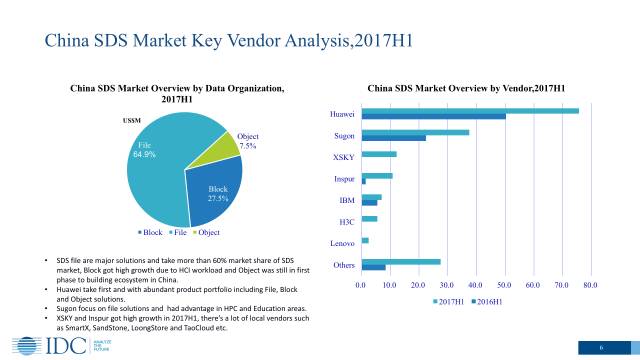 但是从SDS整体市场看,其实文件型的SDS才是大头,超过60%的市场份额。而对象存储则不足10%的空间。可惜XSKY没有分享文件SDS的市场格局(我猜想可能文件SDS的TOP厂商里面没有XSKY,因此就没有分享。我记得XSKY是基于Ceph的,基于Ceph的文件服务目前一般不建议商用,但也有不跟主流走的,如SUSE的发行版可以商用文件服务)。不过,从上图看,整个上半年,华为整体的SDS份额是第一的,而且领先第二名很多,因此我猜想文件SDS中华为应该也有不少份额才行。FusionStorage 6.0的文件和对象功能其实还是原来OceanStor 9000解耦过来的,但国内一般还是销售OceanStor 9000形态多些,因此,不知道这个报告是否把OceanStor 9000也算成SDS?