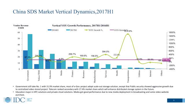从IDC的报告看,SDS的TOP3行业和外部存储不同。SDS的最大行业是政府,然后是运营商。传统存储的大行业——金融相对比较保守,在SDS这部分只排名第五,被教育和媒体行业超过。