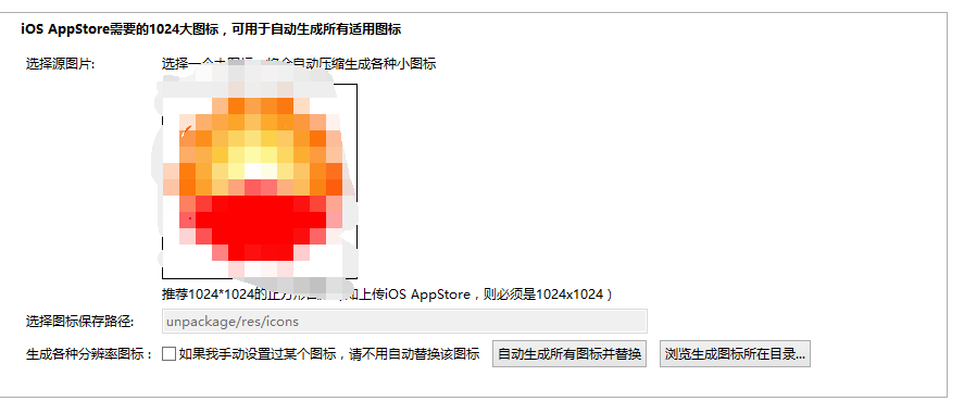 1)点击"+"号的正方形方框,选择图标素材的路径找到图标素材,再点击" 自动生成所有图标并替换"按钮,完成图标生成和替换。