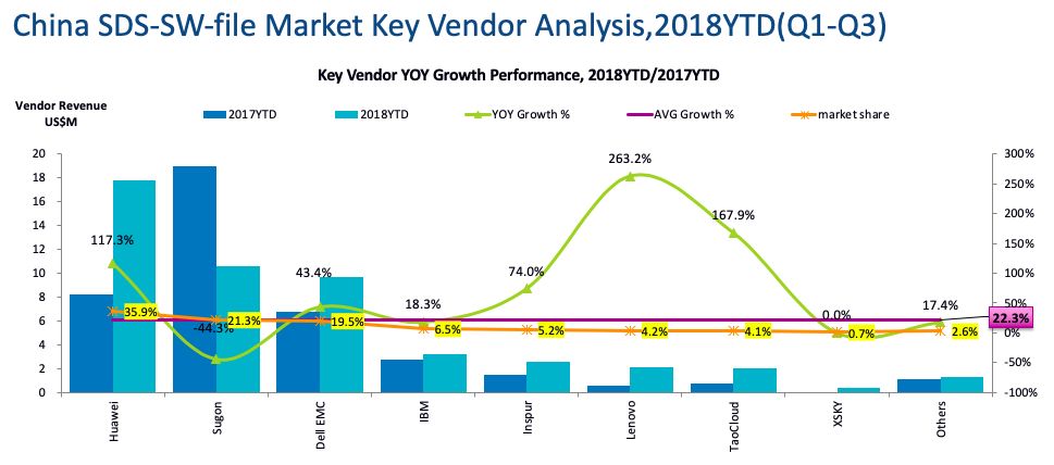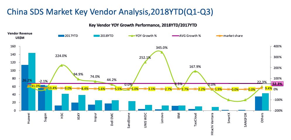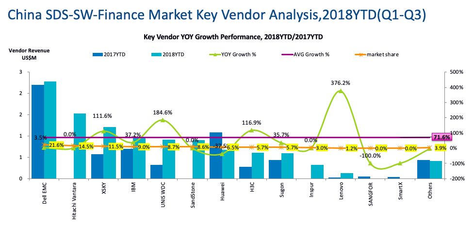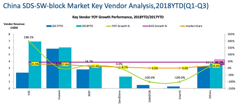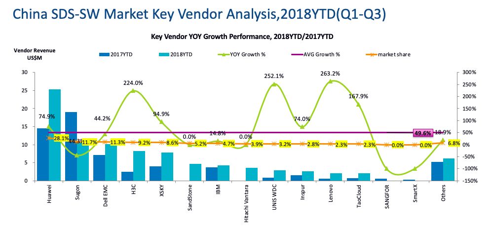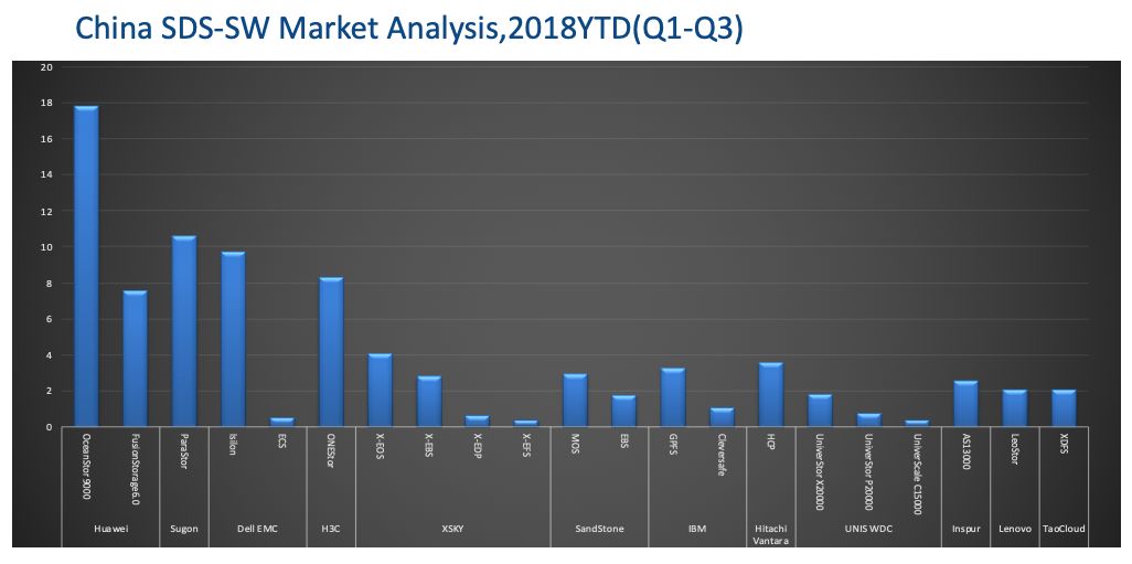我们看到,中国的SDS市场18年前三个季度和17年同比增长了52.3%,这个比例肯定远远高于外部存储的增长。大家要注意的是,这里的数据不仅仅包含SDS的软件,而且包含SDS带动销售的硬件部分。我看数据里,不管你销售不销售硬件,所有你带动销售的服务器硬件,不管具体品牌,都算软件厂商的销售额。因此,下面的销售额并不能代表真正的厂商销售额,而只是对市场的影响力的一种量化而已,这个大家要搞清楚。否则就会发现和你了解的市场数据对不上。