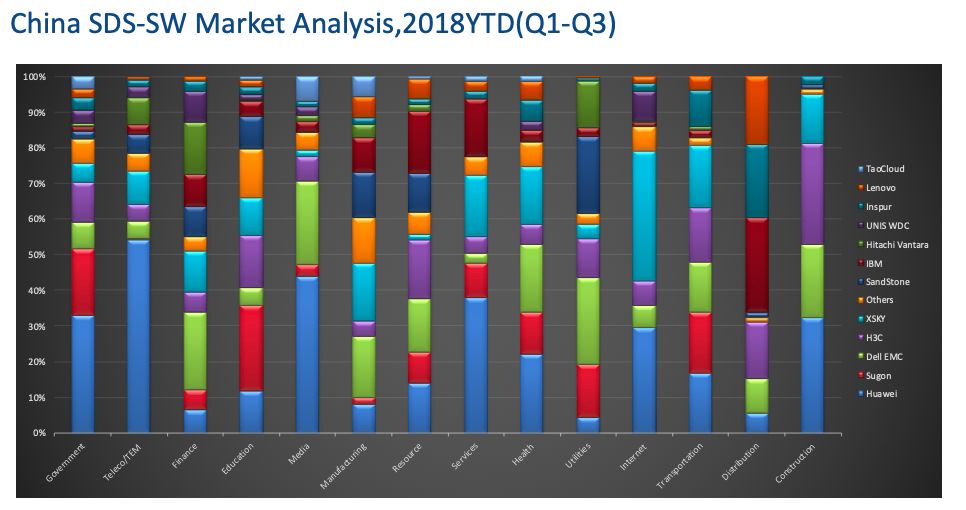 最后我们来看一下各个行业的各个厂商的市场份额分布。我们看到,这些份额其实和厂商的背景还是有一些关联的。比如,Huawei原来是做运营商的,因此运营商里,其份额是最高的。而XSKY原来的创业团队来自互联网,因此在互联网行业,其份额也是最高的。