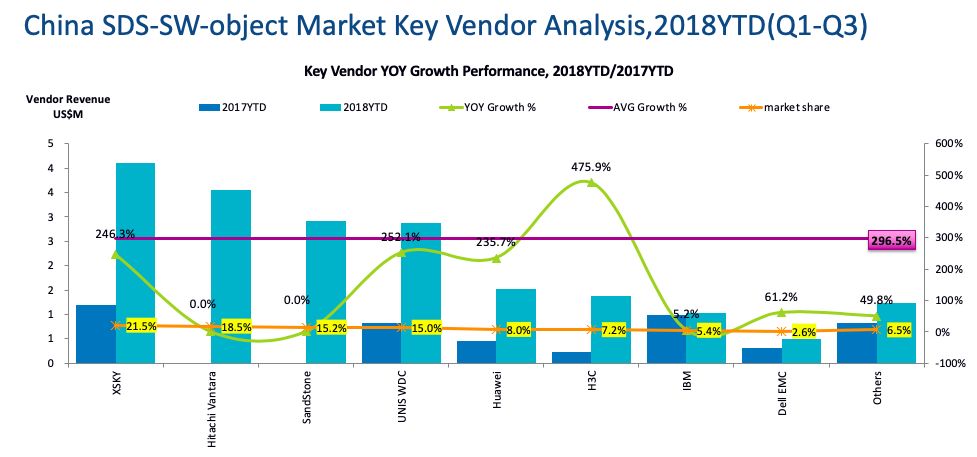 而且,我们看到,这个市场是创业公司占优,XSKY保持高速增长,保住了市场第一的位置。但传统存储公司也在追赶,我们看到Hitachi Vantara抢到了第二。另外一个创业公司SandStone异军突起,占据了第三位置。也就是TOP3里面有两家创业公司。