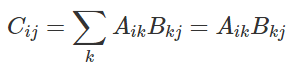矩阵乘法也可写为Einstein notation。例如我们有A、B两个矩阵,它们做矩阵乘法(matrix multiplication)得到C,