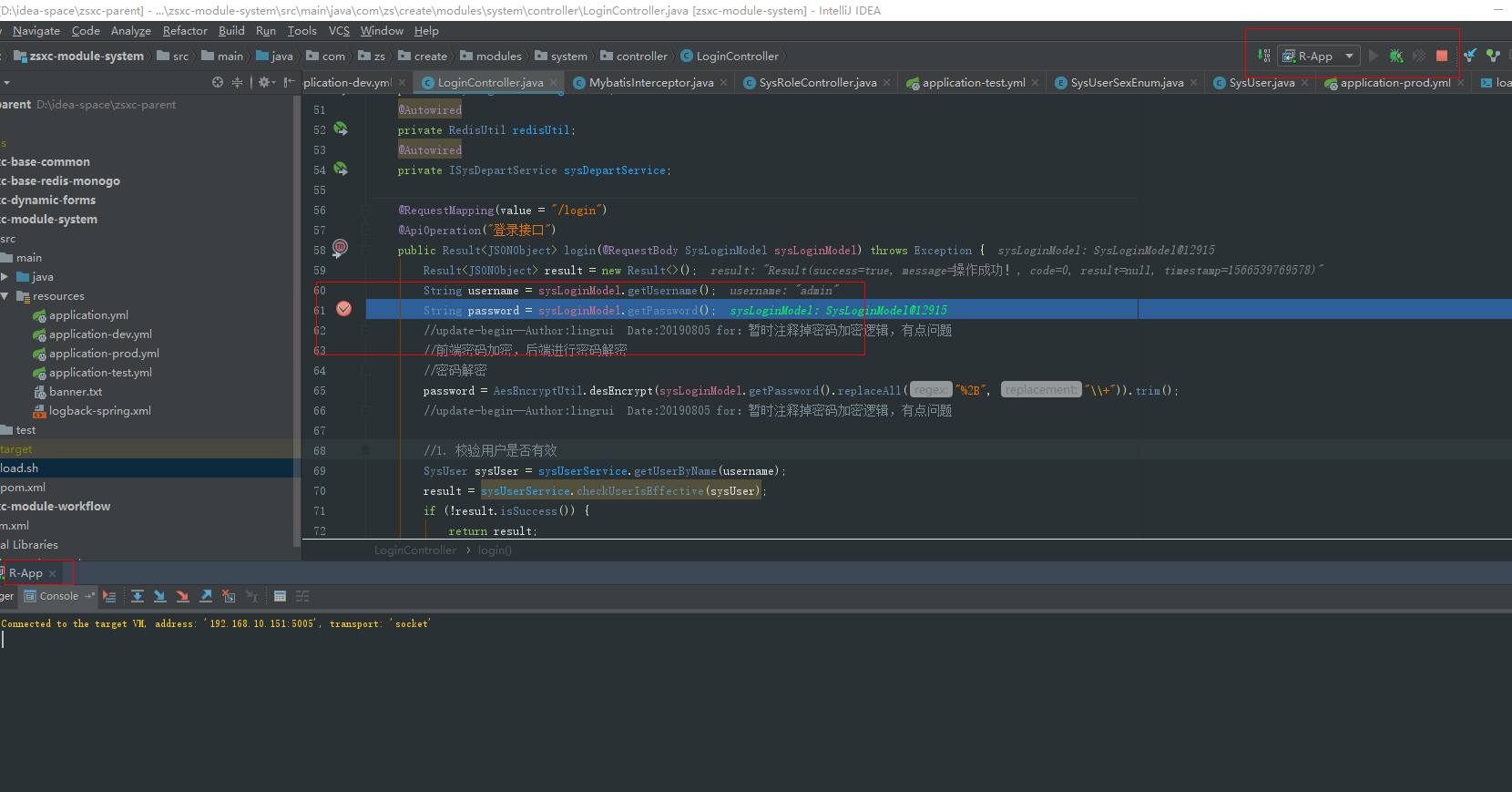 4)启动本地调试应用,打好断点,访问服务器端部署程序(我这边访问的应用登录接口,做断点调试)