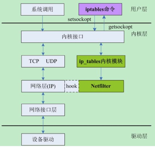 Netfilter是Linux 2.4.x引入的一个子系统,它作为一个通用的、抽象的框架,提供一整套的hook函数的管理机制,使得诸如数据包过滤、网络地址转换(NAT)和基于协议类型的连接跟踪成为了可能。Netfilter在内核中位置如下图所示: