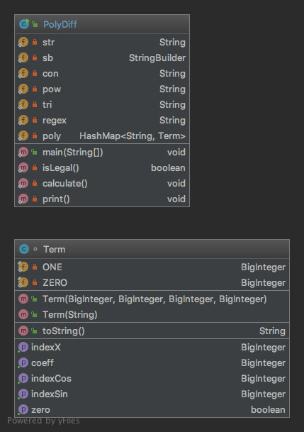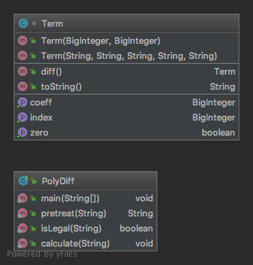 由于刚接触Java语言,也不太懂什么是面向对象思想,所以程序整体来说还是比较C type的。也可能是由于本次作业比较简单,所以也并没有用到继承、接口之类的东西。从类图中可以看到,一共也就两个类,其中PolyDiff完成主函数、预处理、合法性判断等任务,而Term则实例化出多项式中的每一项,保存系数和指数,并提供diff()求导方法。