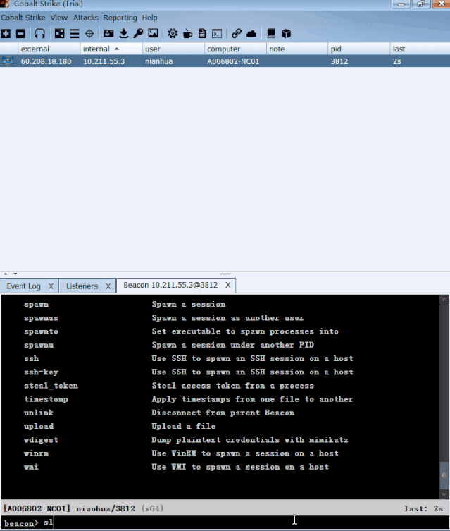 我们可以将beacon会话注入到另一个进程之中,注入后,即使原来的后门进程被关闭,我们依然可以拥有目标主机的权限