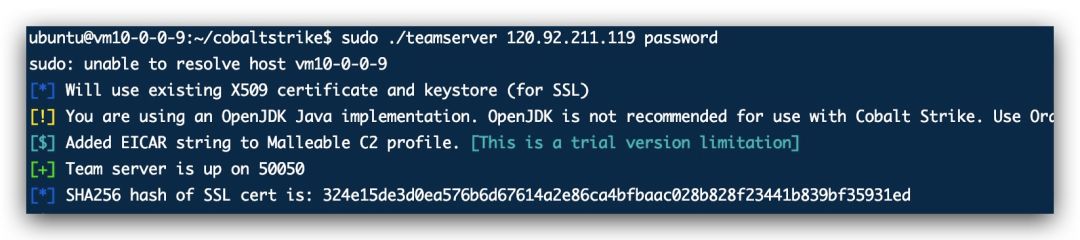 attacker@ubuntu#启动方法:./teamserver <serverIP> <password> <~killdate> <~profile>#~为可选参数ubuntu@vm10-0-0-9:~/cobaltstrike$ sudo ./teamserver 120.92.211.119