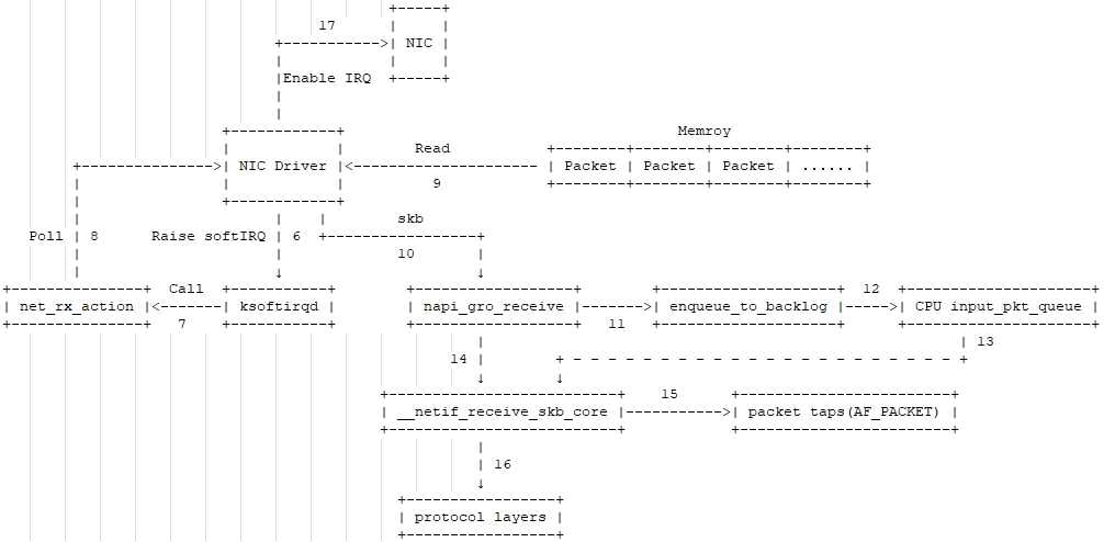 17: 待内存中的所有数据包被处理完成后(即poll函数执行完成),启用网卡的硬中断,这样下次网卡再收到数据的时候就会通知CPU。