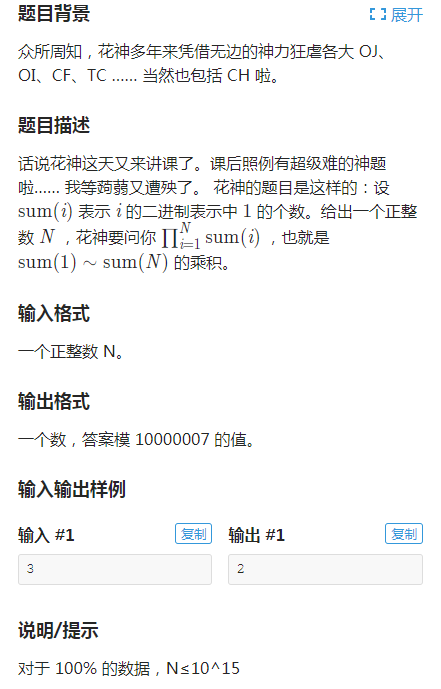 题意就是说求1~n每个数二进制含有1的个数的乘积