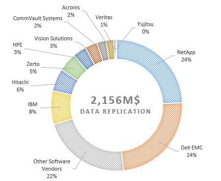 至于数据复制软件,2017年总体的空间是22亿美金。我们看到,Netapp和Dell EMC这些传统的存储厂商占据了近一半的市场份额,后面第三和第四名也是IBM和Hitachi这些传统存储厂商。
