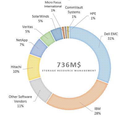 这块,Dell EMC份额最高,其次是IBM。第二梯队有Hitachi、Netapp、Veritas。我们看到,基本都是传统的外部存储厂商,因为SRM基本都是多设备管理,容量管理,性能管理,配置管理这些东西,一般还是各个厂商管各个厂商的更多一些。IBM估计跨厂商管理做得比较好,因为其本身外部存储的份额应该没有这么高。