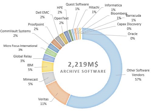 归档软件市场空间也不小,有22亿美金。但是,我们看到这块大厂商不多,只有Veritas的份额超过了10%。