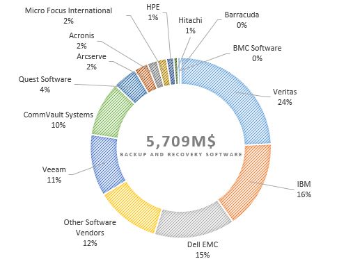 我们看到,传统的备份厂商Veritas、IBM和Dell EMC还是占据TOP3的位置,但是Veeam和CommVault正在迎头赶上,市场份额都超过了10%。