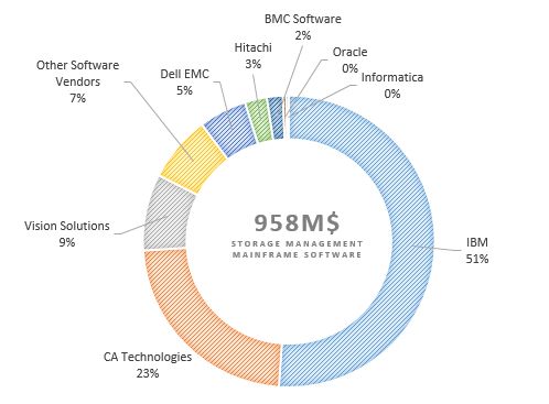 这块市场相对封闭,IBM超过一半的份额,其次是CA。我们看到Dell EMC有5%的份额,Hitachi有3%,他们主要应该都是高端存储里面的增值软件吧。