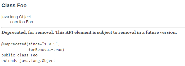 */@Deprecated(since = "1.0.5", forRemoval = true)public class Foo {}