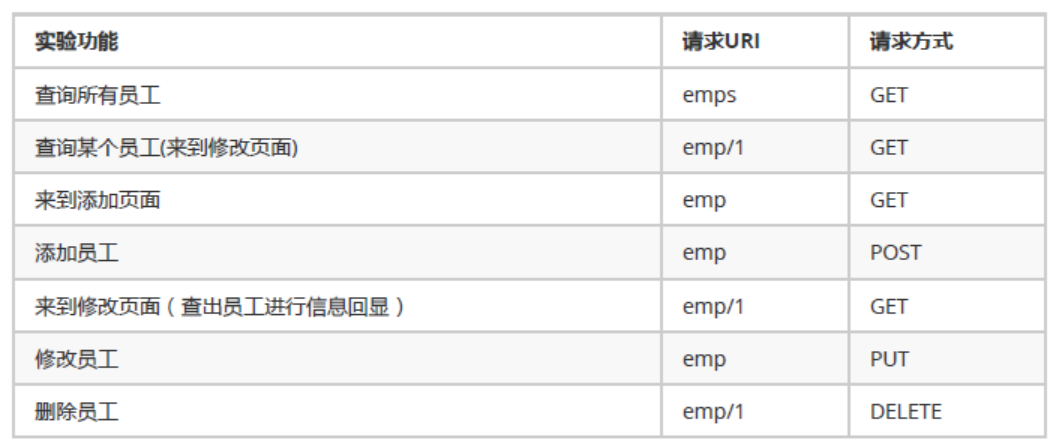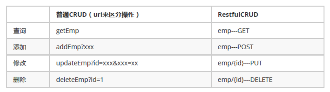 | 删除 | deleteEmp?id=1 | emp/{id}---DELETE |