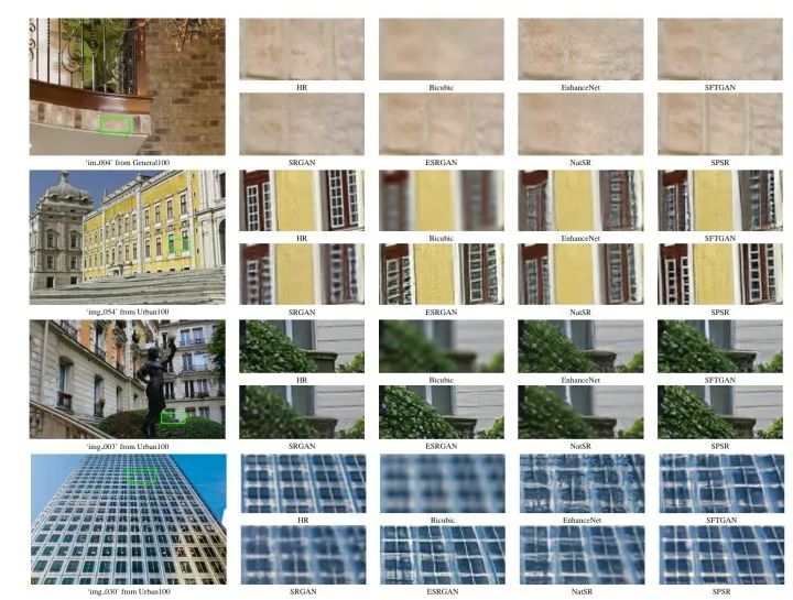 然后通过生成图像的可视化对比,可以看到其它方法生成的图像局部区域几何结构上都存在较为明显的形变,SPSR 生成的结果则更加自然而且真实。除此之外,SPSR 图像更加纯净没有明显的伪影和形变。以上也充分说明了 SPSR 方法的有效性。