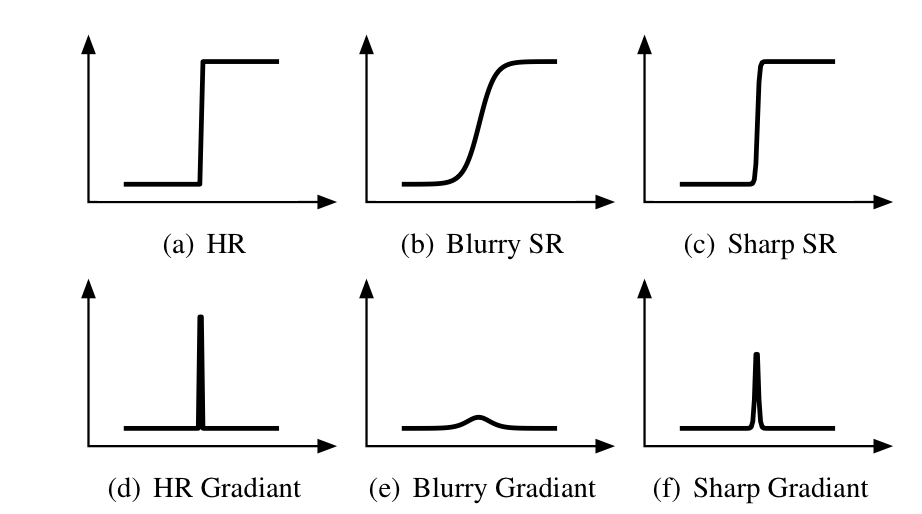 该模型无法恢复锋利的边缘,原因在于该模型倾向于从训练数据中给出所有的HR序列统计的中位数值。于是再这种情况下,如果计算并显示两个序列的梯度值,则可以观察到SR梯度是平坦且峰值较低,而HR的梯度是一个尖峰。两者梯度分布相差明显。