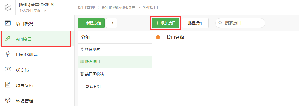 在项目详情页,点击侧边栏 API接口 ,进入API接口管理页面: