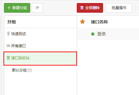 点击分组侧边栏中的 接口回收站: