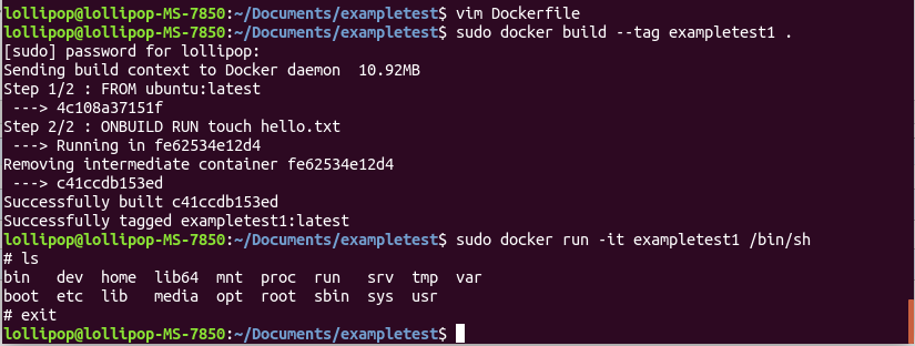 发现并没有执行ONBUILD后的RUN touch hello.txt,然后我修改Docker文件,再以此创建的镜像再次创建镜像exampletest2