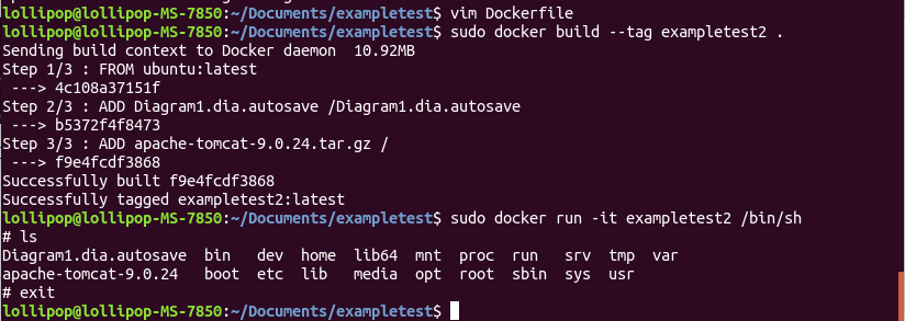 可以看到添加到容器内的两个文件,添加的tar.gz文件会被解压。注意:要复制的文件的路径以上下文为基准,即要和Dockerfile在同一文件夹下。除此,<要添加的文件>也可以设置为目录或者网络文件的URL,如ADD hello-dir /hello-dir、ADD http://localhost:8080/apache-tomcat-9.0.24.tar.gz /。