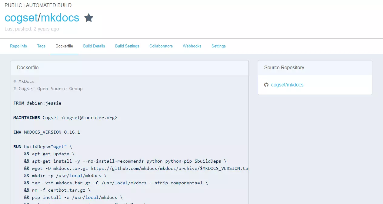 要得到镜像的 Dockerfile 文件,我们可以进入到镜像的详情页面,在介绍中,镜像作者们通常会直接把 Dockerfile 的连接放在那里。