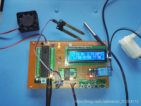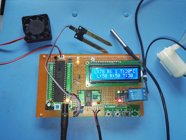 3、通过土壤湿度传感器检测土壤的湿度,并且将湿度值实时显示在液晶上,并且可以设定土壤的使读者,当土壤湿度小于设定的阈值,水泵加水。大于阈值时,不动作。