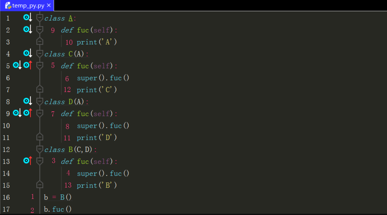 print(B.mro()) #[<class '__main__.B'>, <class '__main__.C'>, <class '__main__.D'>, <class '__main__.A'>, <class 'object'>]