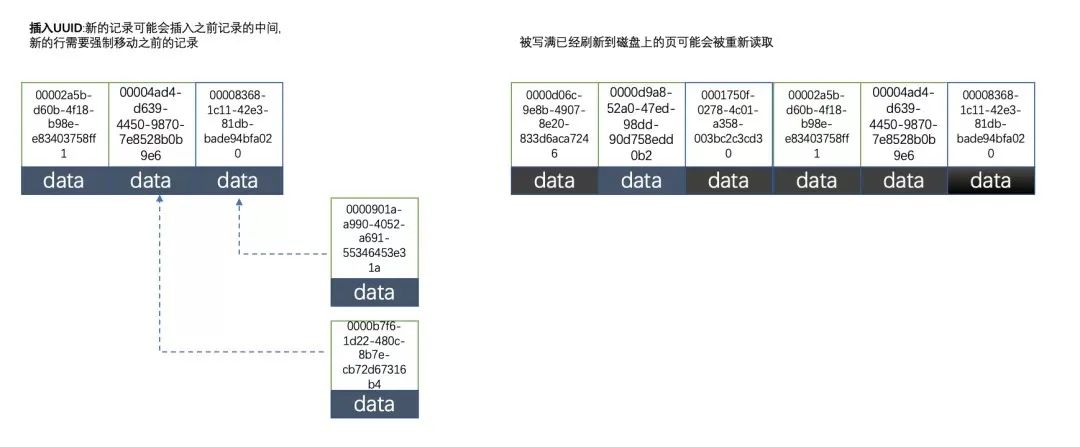 因为uuid相对顺序的自增id来说是毫无规律可言的,新行的值不一定要比之前的主键的值要大,所以innodb无法做到总是把新行插入到索引的最后,而是需要为新行寻找新的合适的位置从而来分配新的空间。