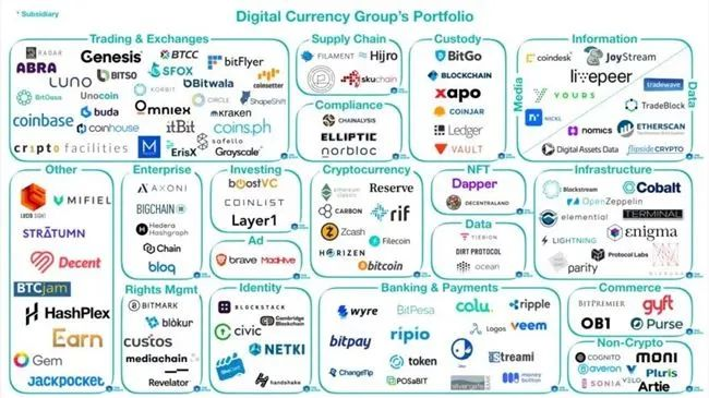 作为加密世界最重要的幕后参与者,DCG不仅是灰度信托的直接掌控者,还是最大的加密货币场外交易与借贷平台之一Genesis、著名区块链媒体Coindesk、新兴矿业服务商Foundry以及交易所Luno的母公司,并直接投资了Bitpay、Circle、CoinList、Coinbase、Ledger、EtherScan、Paxos、Protocol labs、Xapo等知名加密公司与机构。