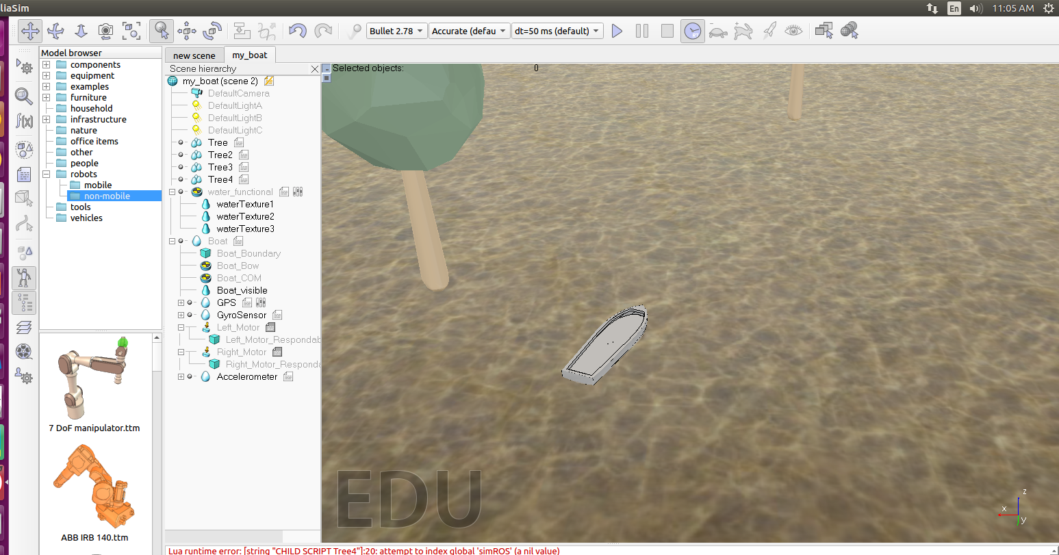 2、在vrep界面中,双击每个名字后面的小文档(child_script),会出现该物体的lua执行代码。vrep端发送的话题主要有 gps_data、imu_data、left_motor 、right_motor、goal等,主要在 Tree 、Boat、GPS 这三个物体的文档里。